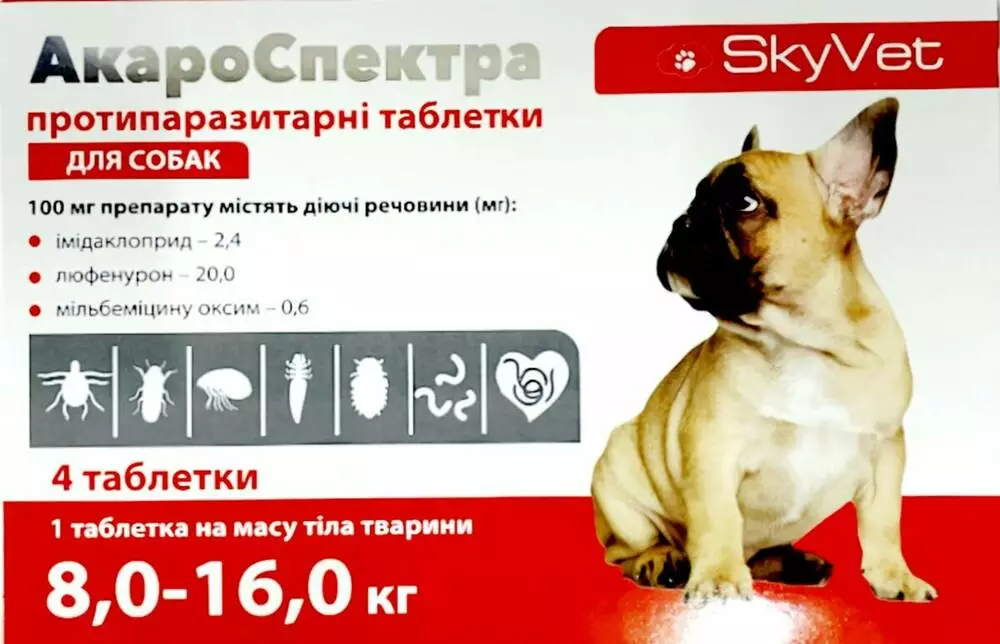 АкароСпектра протипаразитарні таблетки для собак – паразитицидний засіб, що застосовується для профілактики та лікування собак проти зовнішніх паразитів (членистоногих: бліх, кліщів тощо), а також проти внутрішніх паразитів (нематод).