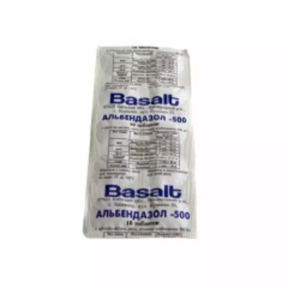 Опис: Таблетки білого з сіруватим відтінком кольору, з ароматизатором або без нього.Склад: діюча речовина – альбендазол 500 мг, каолін або кукурудзяний крохмаль, формоутворюючі речовини.