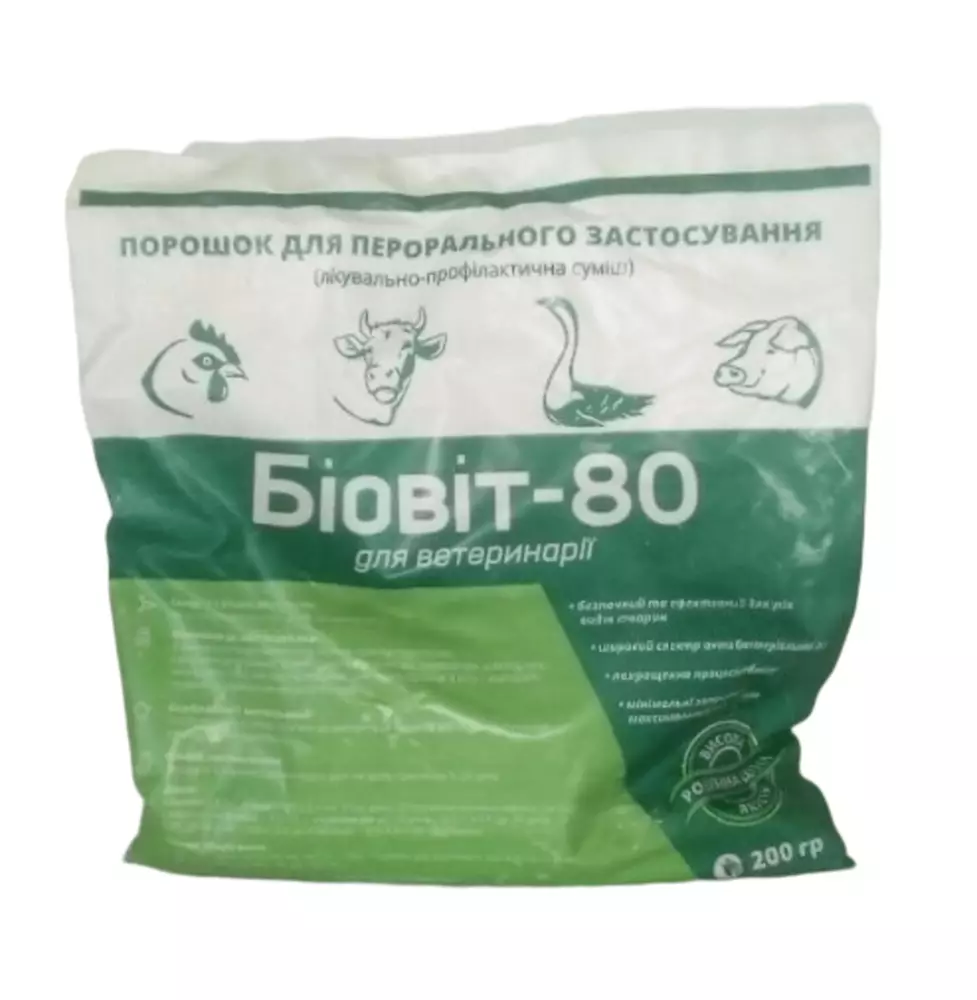 Дія хлортетрациклина засноване на придушенні росту і розвитку багатьох грампозитивних і грамнегативних мікроорганізмів , у тому числі стрептококи . , Золотистого стафілокока , кишкової SPP . , Shigella SPP . , Сальмонела . , Enterobacter SPP . , Pasteurella SPP . , Klebsiella SPP . , Лептоспіри SPP . , лістерій , Fusobacterium SPP . , Clostridium SPP . , Mycoplasma SPP . , Chlamydia SPP . , Haemophilus SPP . , Bacillus SPP . , Actinomyces Бові , Bordetella SPP . , Brucella SPP . , бактерії роду трепонема . , рикетсії . Препарат малоефективний проти протея , синьогнійної палички і кислотостійких бактерій , а також проти більшості грибів і вірусів. У крові терапевтична концентрація його утримується на високому рівні близько 8 - 12 ч. Хлортетрациклин виводиться з організму в основному протягом першої доби з сечею і фекаліями . Вітаміни групи В є регуляторами біохімічних процесів в організмі , при недостатньому їх надходженні розвиваються важкі захворювання обміну речовин , анемія , парези та паралічі , ураження шкіри та інші порушення . Біовіт -80 позитивно впливає на обмінні процеси в організмі , стимулює клітинний і гуморальний імунітет , посилює газообмін у легенях , прискорює ріст і підвищує стійкість тварин і птахів до шлунково - кишкових захворювань. При застосуванні кормового антибіотика різко знижується падіж , збільшується середньодобовий приріст ваги , підвищується продуктивність сільськогосподарських тварин і птахів. Біовіт -80 безпечний для застосування у тварин , не володіє алергізуючих і сенсибілізуючими властивостями.