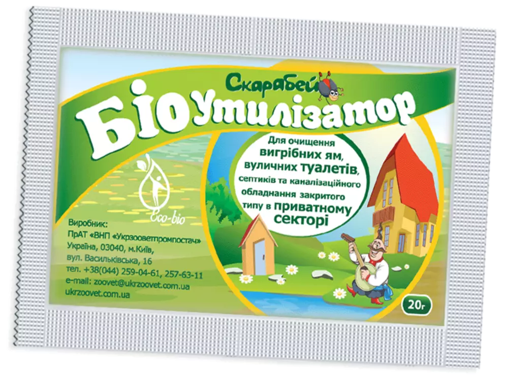 Біоутілізатор «СКАРАБЕЙ» - це високоефективна композиція адаптованих до специфічному середовищі бактерій. Оптимально підібраний склад біопрепарату і висока ферментативна активність композиції бактерій дозволяють швидко утилізувати всі типи побутових органічних відходів. При внесенні в вигрібну яму мікроорганізми активно розкладають залишки, накопичені в результаті експлуатації. При цьому поступово зменшується вміст твердих фракцій (фекалій) і відновлюється дренаж грунту. Наявність миючих засобів, за винятком хлорвмісних засобів типу «БІЛИЗНИ», не впливає на швидкість біологічного розкладання. Спорові культури, що входять до складу препарату, мають також антагоністичну активність до хвороботворної мікрофлори, сприяє знезараженню органічних відходів.